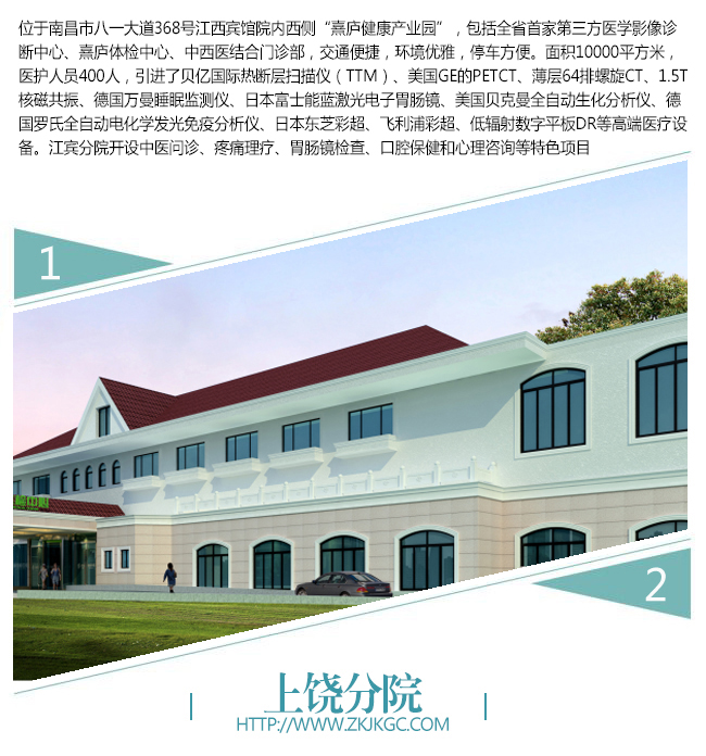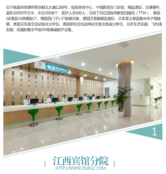 江西中科健康體檢中心位于南昌市洪都北大道1288號(洪都大橋引橋下),交通便利,環境優美,實用面積8000平方米,車位200余個。江西省目前專業化程度高、規模大、設備先進、檢查項目齊全的健康體檢和健康咨詢服務機構。